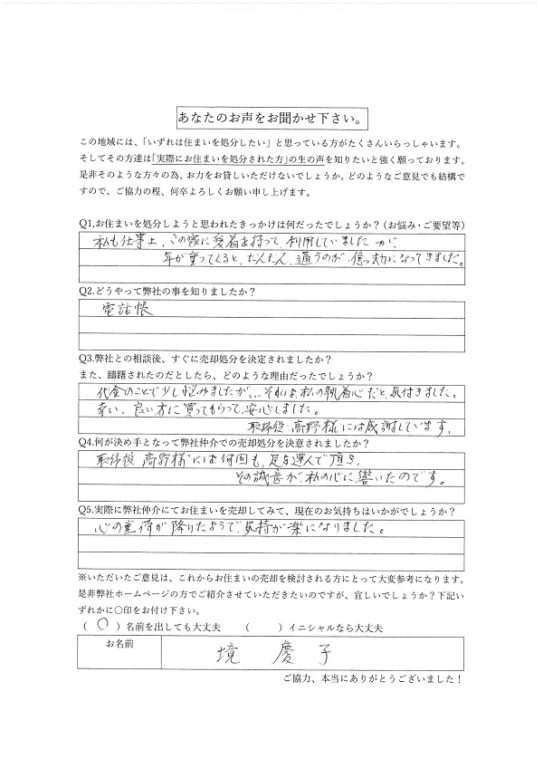 代金の事で少し悩みましたが、それは私の執着心だと気付きました。幸い、良い方に買って貰って安心しました。取締役、高野様には感謝しています。