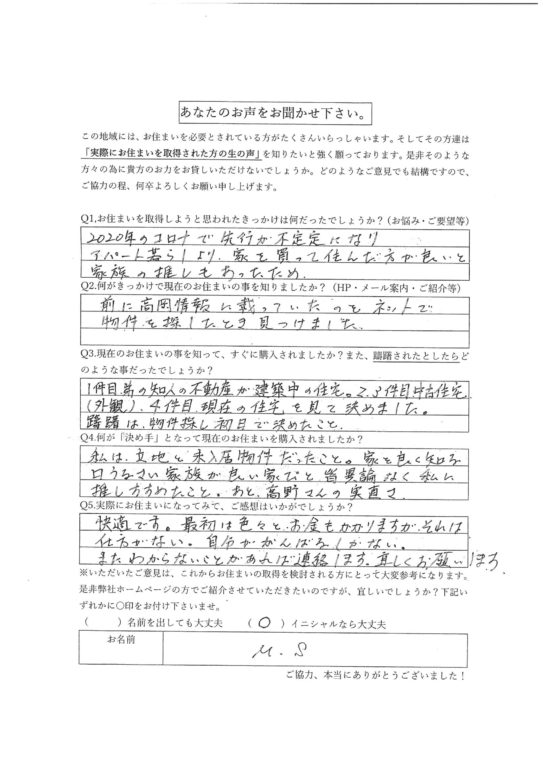 私は、立地と未入居物件だったこと。家(の事)を良く知る口うるさい家族が「良い家だ」と皆異論なく私に推しすすめたこと。あと、高野さんの実直さ。