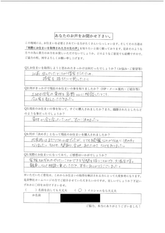 土地や住宅の条件を高野さんに相談したところ、今の家を教えていただきました。