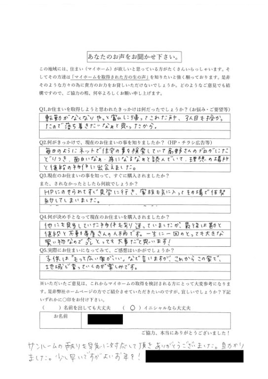 子供は「もっと大きい家がいい」など言いますが、これからこの家で、地域で育っていくのが楽しみです。サンルームの雨漏りも早急に対応していただきありがとうございました。助かりました。少し早いですが良いお年を!