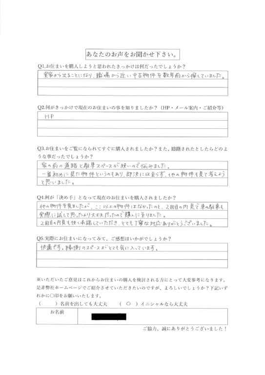 他の物件を見ましたが、ここ以上の物件はなかったのと、2回目の内見で車の駐車も実際に試して思ったより大丈夫だったので購入に至りました。2回目の内見も快く承諾していただき、とても丁寧な対応ありがとうございました。